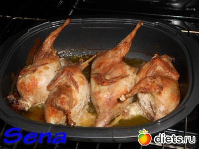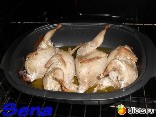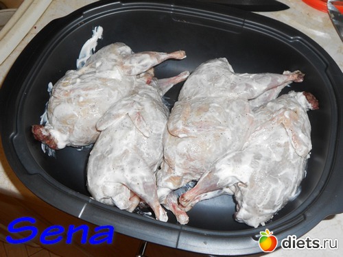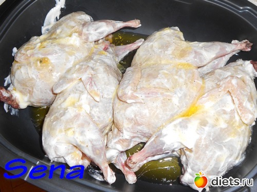 Каждую тушку натереть сметаной снаружи и внутри и сложить в форму