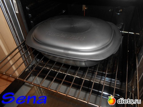 Накрыть форму крышкой (если нет формы можно в фольгу завернуть или в рукав для запекания) и в духовку при 200 градусов