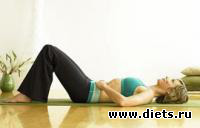 Остаемся лежать на полу на спине. Теперь вытягиваем руки вдоль тела и быстро вдыхаем и выдыхаем в течение 10 секунд. Далее, втягиваем максимально живот и медленно поднимаем ступни вверх, чтобы они оказались перпендикулярными полу. Теперь нужно обхватить ноги руками, притягивая их к туловищу, при этом ягодицы все время находятся на полу. Задержитесь в этом положении 10 секунд без дыхания. По истечении 10 секунд полностью расслабьтесь и лягте на пол. Выполняем упражнение минимум 4 раза.