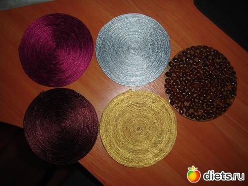 Остальные, еще проще. Вам потребуется - сд-диски, я старые брала, двусторонний скотч и разноцветные шнуры. Можно делать разноцветные подставки, можно однотонные. сд-диски помыть (я водкой протирала), высушить, заклеить двусторонним скотчем и от середины наматывать по спирали шнур, хорошо его прижимая.
