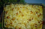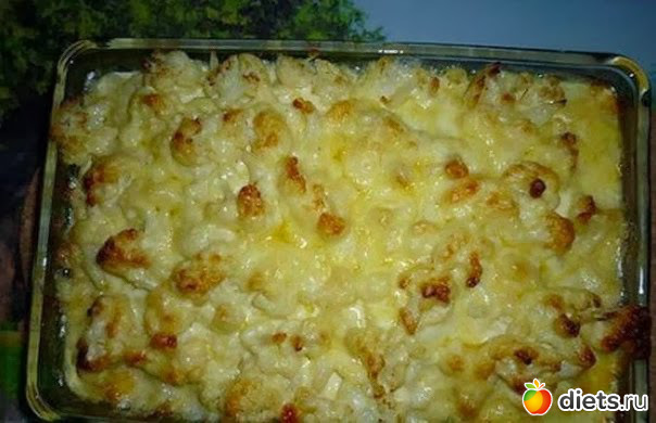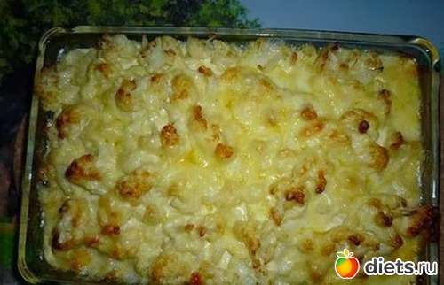 На противень, смазанный растительным маслом, выложить куриное филе (куриное филе даёт сок и таким образом проваривается — предварительно проваривать его ненужно). Следом выложить цветную капусту. Залить сливочным соусом цветную капусту с куриным филе.