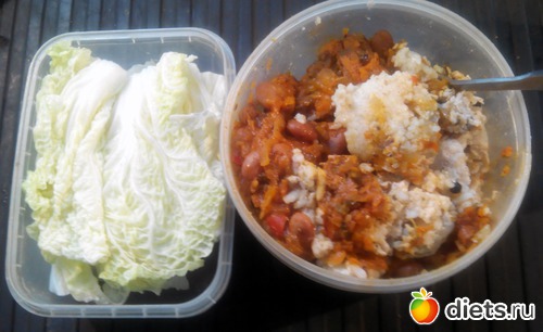Пекинская капуста. Ячневая каша. Фрикадельки из куриного фарша. Фасоль.