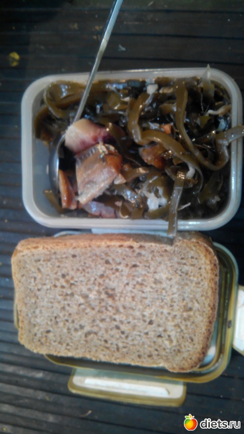 Такое уже было. Копченая сельдь с морской капустой и кусок хлеба.