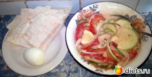 Обнаружил в холодильнике забытое прессованное мясо (кто захочет узнать - что это такое - смотрите мои посты. Оно у меня регулярно появляется и мне надоело объяснять, что это такое). Вот, думаю, хорошая добавка к салату. Потому задумался - а нафиг? Ведь оно достаточно калорийное для ужина, тем более с лавашом, а меньше ста грамм его просто не отрежешь... И... отказался его есть! Ограничился яйцом.