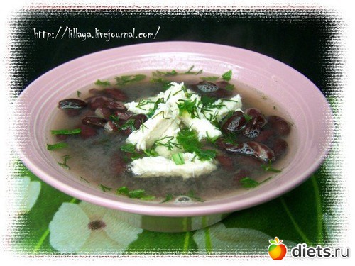 Филе отварить в небольшом количестве воды с луком. Заправить специями, вынуть и порезать мясо, высыпать из банки фасоль и довести до кипения. В тарелку налить суп, положить порезанное мясо курицы и посыпать зеленью. Суп достаточно калорийный, но фасоль имеет одно очень важное качество. При употреблении фасоли организм освобождается от лишней жидкости. Поэтому, при диете самое оно.