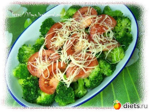 Брокколи отварить до полуготовности. Переложить в форму, полить оливковым маслом посолить и поперчить. Помидор нарезать дольками, уложить поверх капусты и посыпать тертым сыром. Поставить в духовку на 3 минутки. Вкусняшка готова. Приятного аппетита.