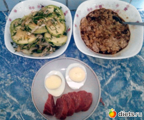 Геркулес с водой. Вареное яйцо. Колбаса... Вот это явление любопытное.называется "Халяль" и по составу там только говядина. Это и по вкусу чувствуется. И салат из кабачка, пекинской капусты и лука.