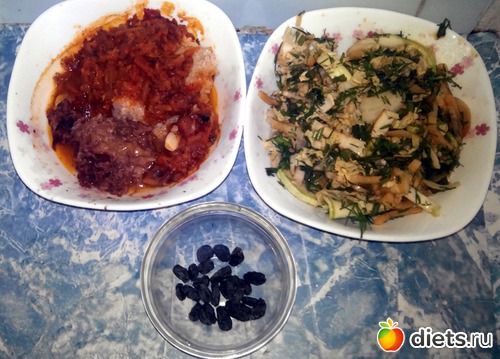 Остатки ячневой каши с фасолью, плюс немного тушенки из конины. Тот же салат, что и утром. Немного изюма.