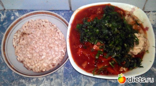 А потом немного подумал и "сообразил" тушеный овощи... Там капуста, морковь, лук, томатная паста и всего столовая ложка растительного масла. Сначала налил на сковороду воды, положил овощи, протушил, потом масло, томатную пасту, соль и специи. Получилось вполне пристойно.