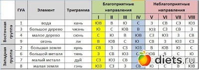 Желтым цветом выделены наиболее активные направления для каждого числа Гуа, именно в этом направление наиболее благоприятно располагать входную дверь дома, квартиры, офиса.