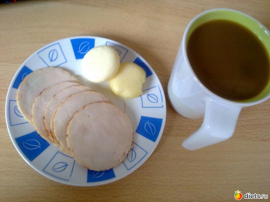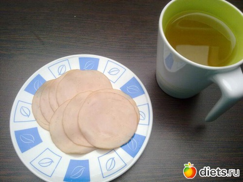 В качестве перекуса (точно не помню когда, кажется между полдником и ужином) был чай с индюшиной колбасой (там ооооочень много белка)