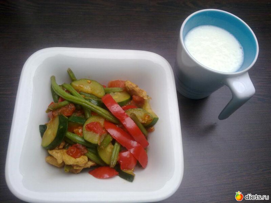 Обед: рагу овощное с куриным филе и кефир (тут я уже не захотела добавлять еще кучу углеводов)