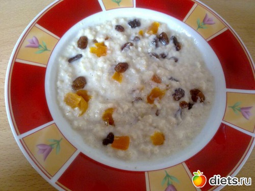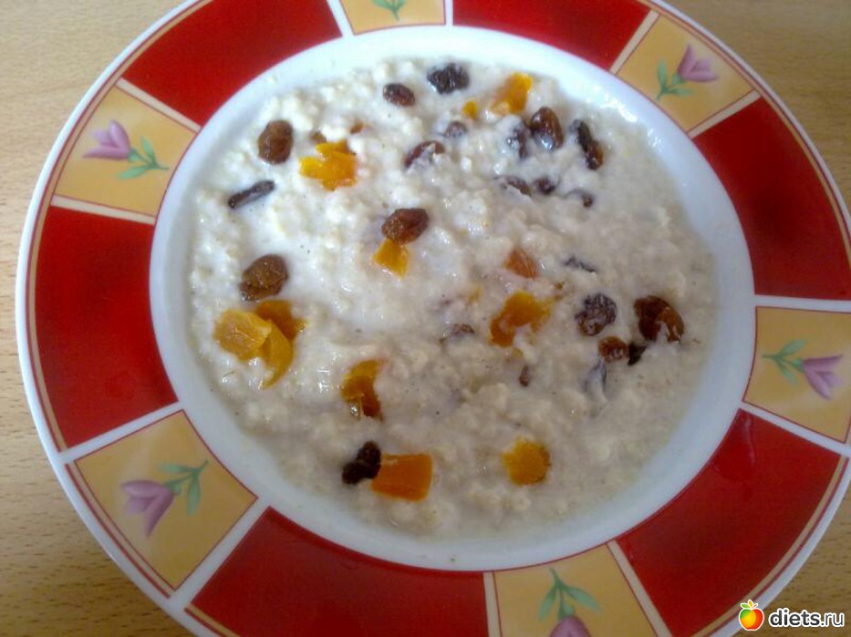 Завтрак: овсяная каша с курагой и изюмом, кофе с молоком и кубиком сахара, куриная колбаска и сырок.