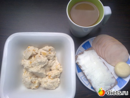 Итак, завтрак: ленивые вареники с отрубями и курагой (люблю их очень), кофе с молоком и кубиком сахара, хлебец с филадельфией лайт, сырок, колбаса индюшиная