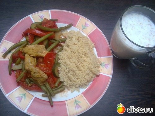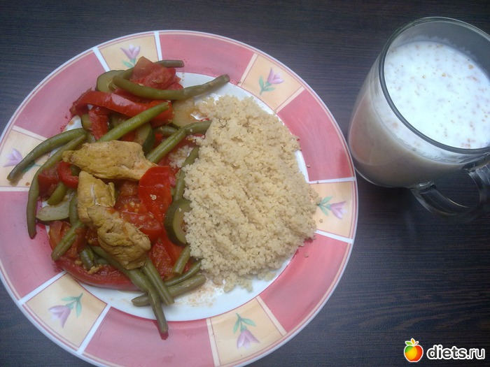 Обед: рагу овощное с куриным филе, кус-кус, кефир с пшеничными отрубями