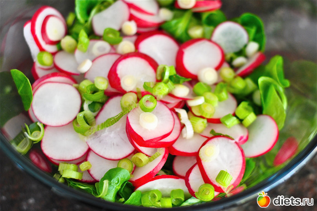 3. брынза, зеленый лук, салатные листья, редис. Заправить соусом из сметаны и укропа.