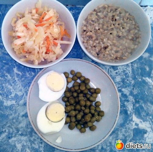 Овсяная каша. Капустный салат. Яйцо и зеленый горошек.