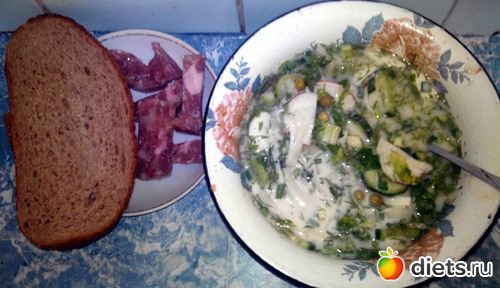 Окрошка. Хлеб. Заливное мясо. В принципе, это тот же холодец, но в виде колбасы. Вполне, кстати съедобный и дешевый мясной продукт.