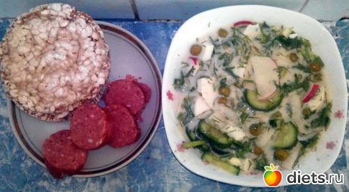 Окрошка, слайсы и колбаса.