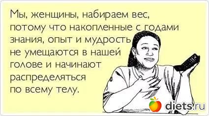 ....другое дело - делать перерывы, остановки......если ты видишь что набрал больше обычного.....что-то предпринять, чтобы привести себя к прежней форме....к идеалу бесконечному при этом идти не нужно....но к комфортному весу вернуться - это необходимо конечно.............а у многих получается ком....разрастающийся.... отсюда и пляшем.....тут уже включаются установки самого человека...его сила воли для преодоления проблемы с весом...его обстоятельства - мешают или способствуют....окружение...помогает или мешает.....итд................вот в каких рамках надо советовать....анализируя вместе, где слабые стороны.....вместе искать причины и устранять их....а не тыкать пальцем и ржать как кони над следствием......комменты многих известных здешних писательниц просто потрясают своей беспардонностью суждения и детскими дразнилками в стиле - что вижу о тебе,то пою