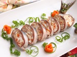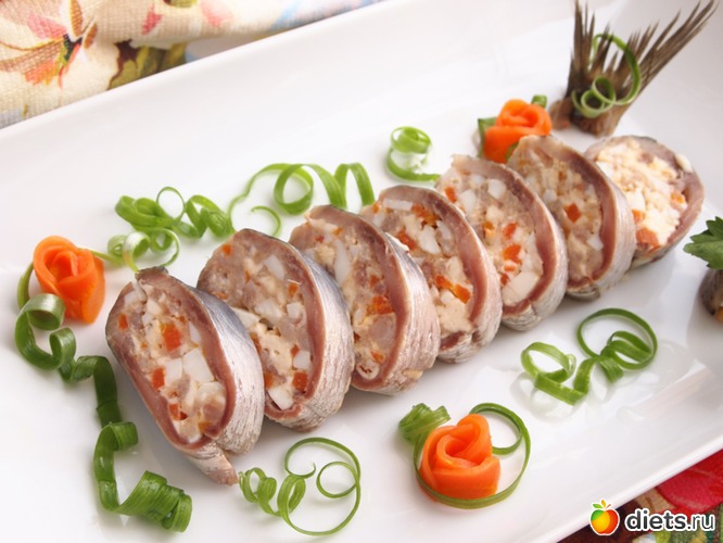 Перед подачей снять пленку, нарезать фаршированную сельдь кусочками. Украсить по желанию.
