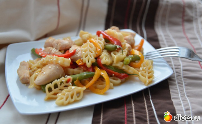 Затем добавить макароны, сладкий соевый соус. Перемешать и прогреть.