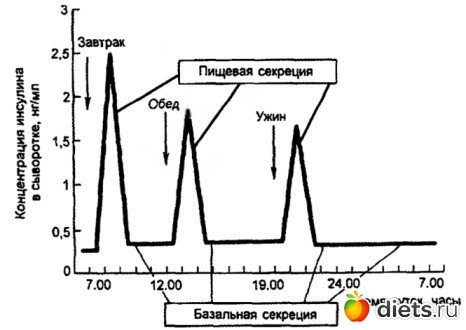 Базальный инсулин секретируется со скоростью примерно 1 Ед/ч. При длительной физической нагрузке или при длительном голодании она существенно уменьшается.