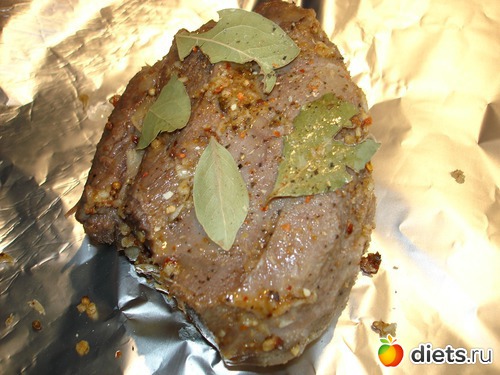 и обмазала этой смесью очищенный язык. Взяла фольгу в два слоя, уложила язык и сверху несколько листиков лаврушки