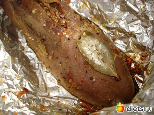 плотно завернула и запекала при 180 гр. около часа. Запах умопомрачительный. Никакой колбасы не надо, очень вкусно, рекомендую