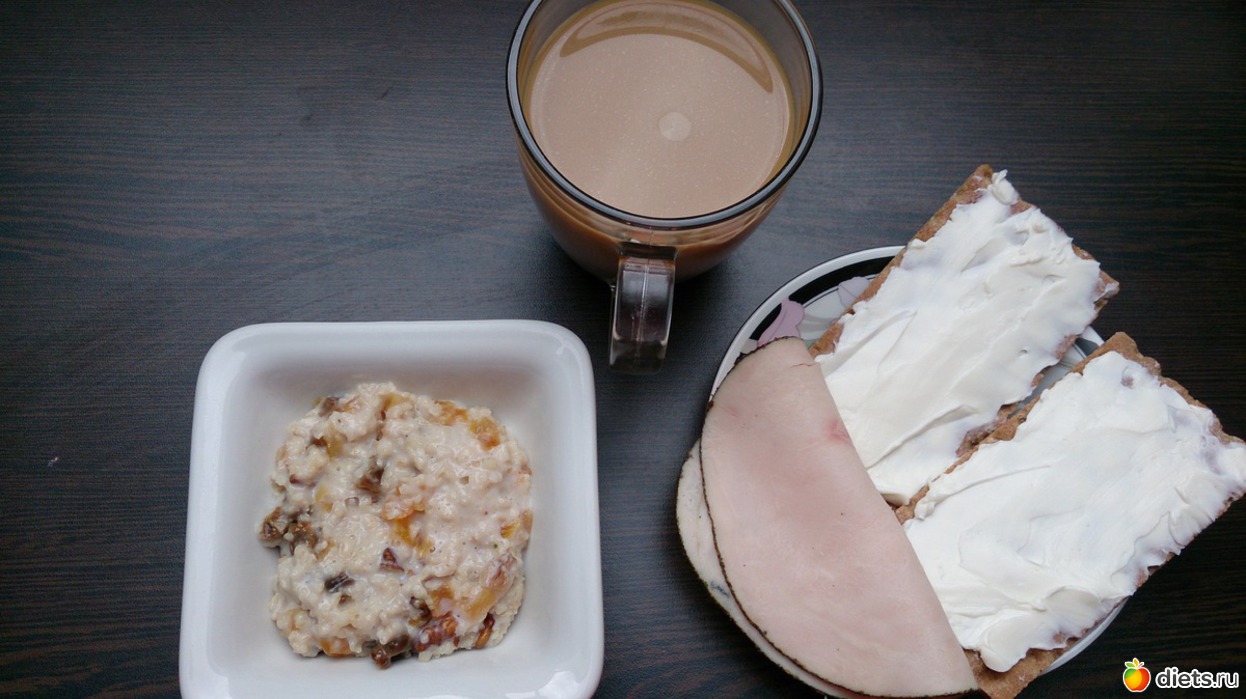 Завтрак: овсяная каша с курагой, инжиром, грецкими орехами, хлебцы с филадельфией, индюшиное филе, кофе с молоком и кубиком сахара