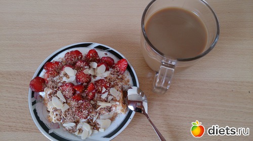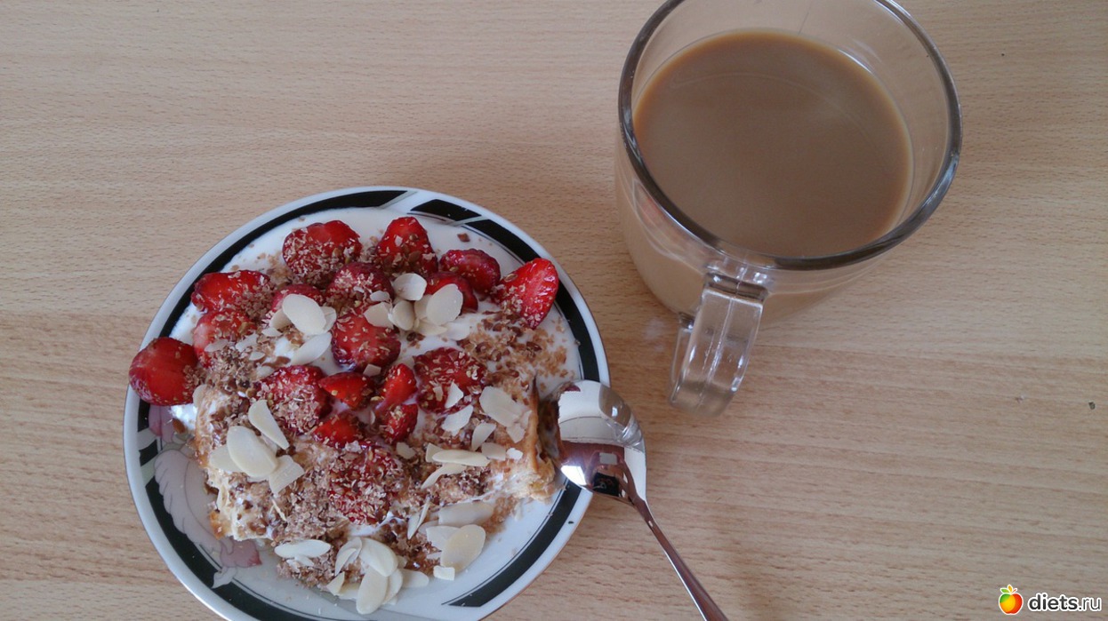 Ланч: тут уж я насладилась, получилось ооочень вкусно. Завтра повторю обязательно. Творожная запеканка с йогуртом, клубничкой, пшеничными отрубями, льняными семенами и миндальными хлопьями, кофе с молоком и кубиком сахара
