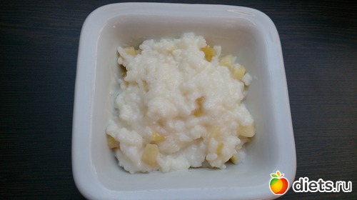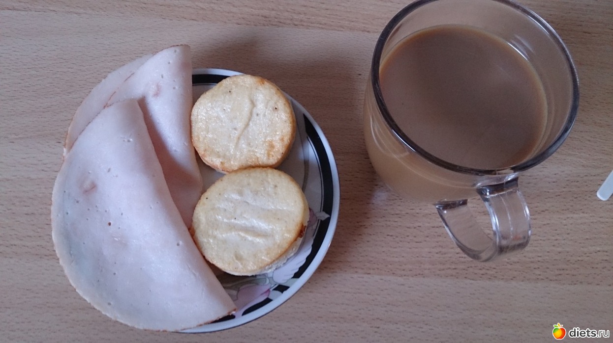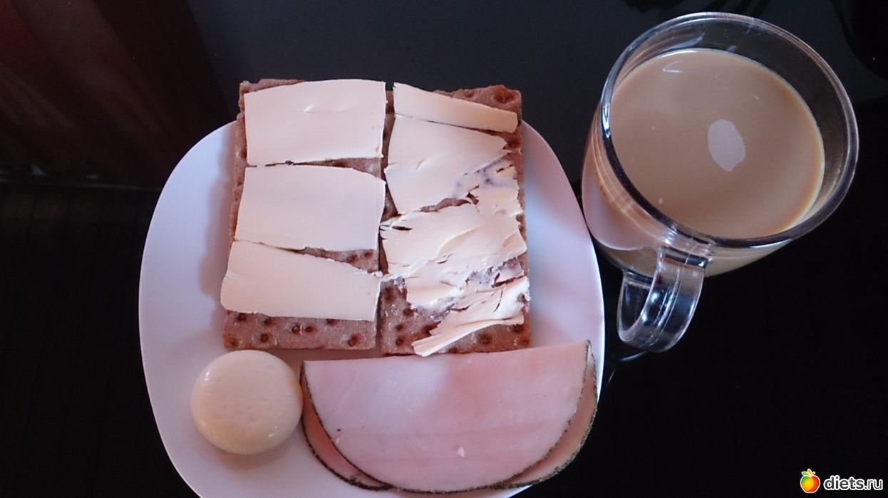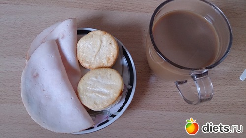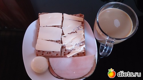 Завтрак: рисовая каша на молоководе (больше воды) с яблоками, хлебцы со сливочным маслом, индюшиная колбаса и сырок, кофе с молоком и куб.сахара