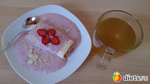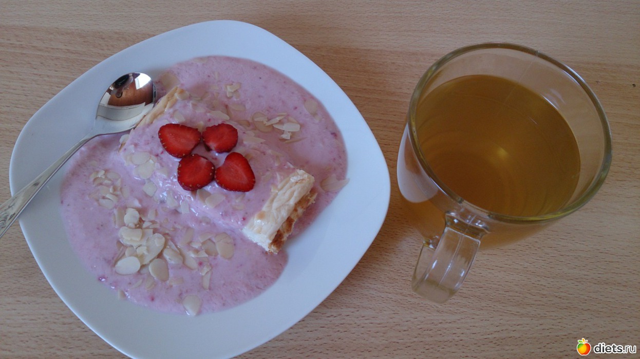 Ланч: творожная запеканка с йогуртом, клубникой, бананом, овсянкой, миндальными хлопьями, чай зеленый