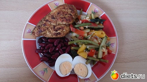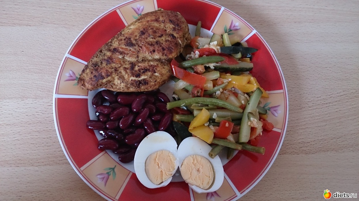 Обед: тушеные овощи, тушеная куриная грудка, яйцо вареное, фасоль красная
