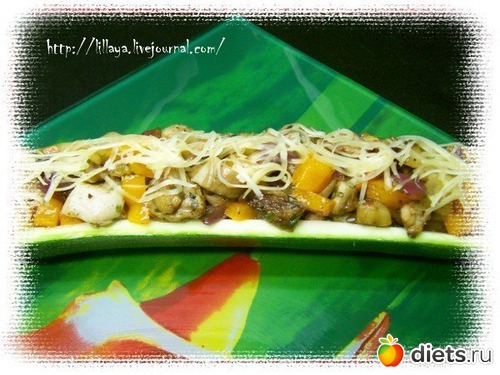 Кабачок разрезать вдоль, выбрать мякоть, порезать мелко, с грибами, перцем и луком. Обжарить на оливковом масле, посолить, поперчить и начинить половинки кабачка. Посыпать тертым сыром и запечь в духовке.
