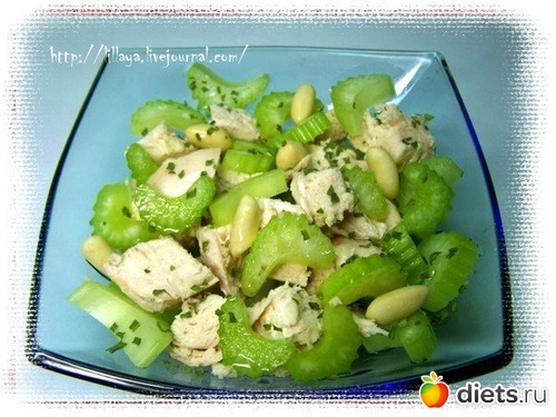 Филе отварить, охладить, порезать, положить в салатник. Черешок сельдерея порезать и добавить к мясу. Заправить маслом, соком лимона, солью и перцем.