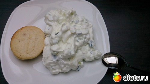 На ужин у меня как раз была подруга, ее кормила бешбармаком, муж тоже его доел, я же ужинала творожной запеканкой с цветной капустой, творогом с огурцом и белком вареным. По вкусу мне это очень напомнило сацики греческое. Не хватало только чесночка чуточку, зеленого лука и немного приправ еще. Завтра повторю обязательно, понравилось очень.