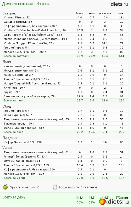 Теперь о питании)))) В принципе я сегодня собой довольна. Был бы еще спорт, вообще бы цены мне не было)))) Шучу...