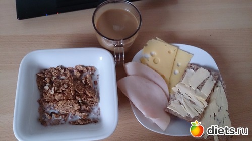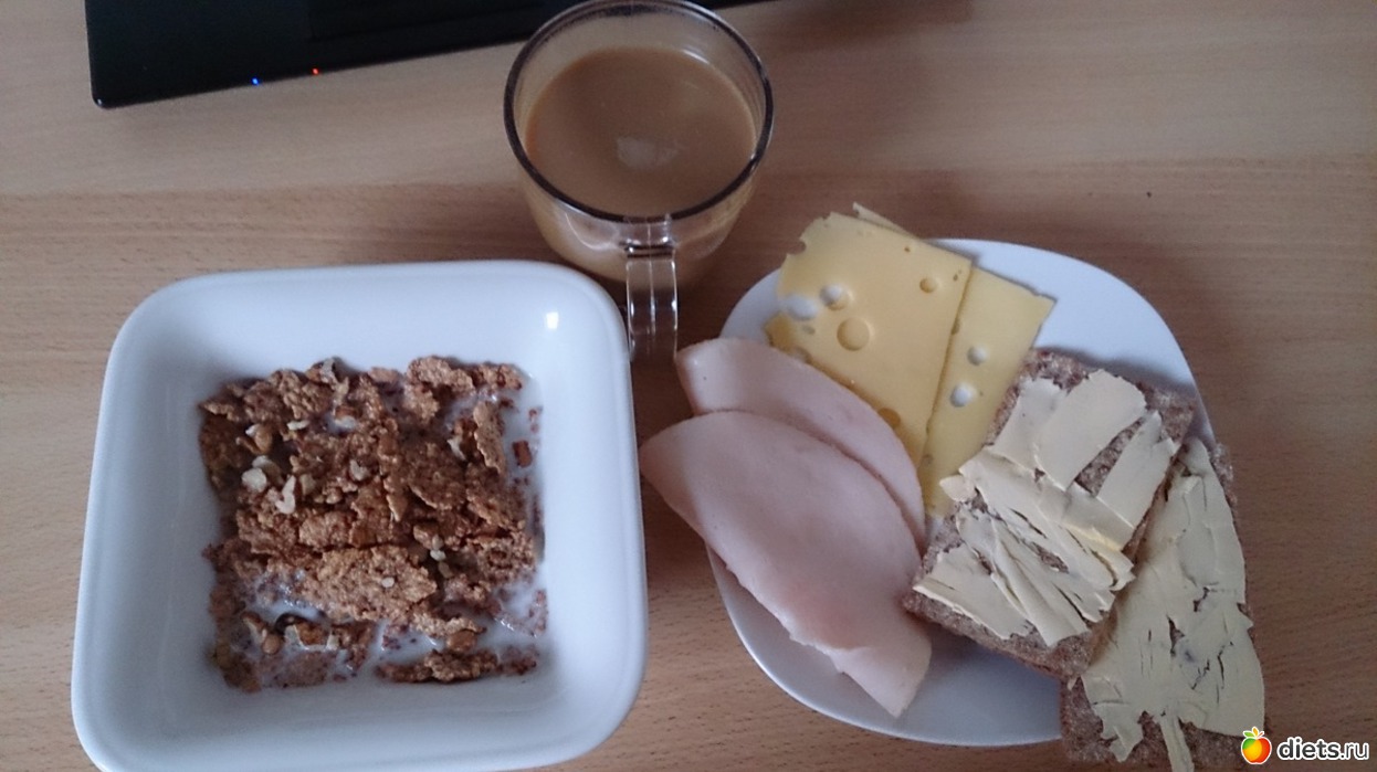 Завтрак: хлопья Фитнесс с молоком и грецкими орехами, кофе с молоком и кубиком сахара, хлебцы со сливочным маслом легким, колбаса из куриного филе и сыр))) Давно так сыр хотелось)))