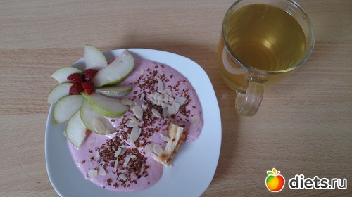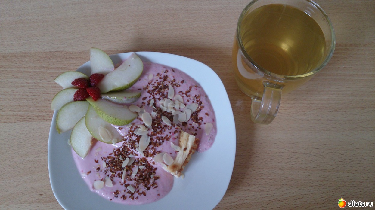На ланч снова творожная запеканка, никак ее не докушаю, на завтра остался последний кусочек и уже что-нибудь другое испытывать буду))) Итак ланч: запеканка с творожно-йогуртовой заливкой с грушей и клубникой, льняными семенами и миндальными хлопьями, чай зеленый