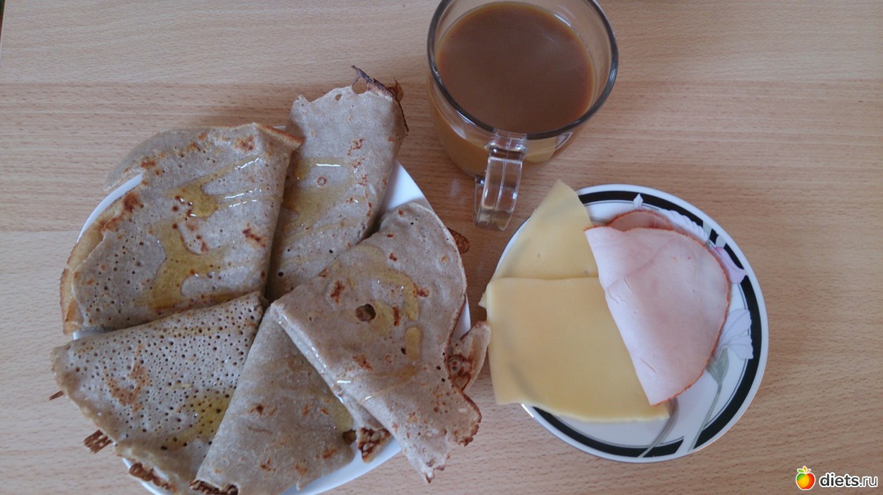 Завтрак: гречневые блинчики, кофе с молоком и кубиком сахара, сыр, колбаса индюшиная