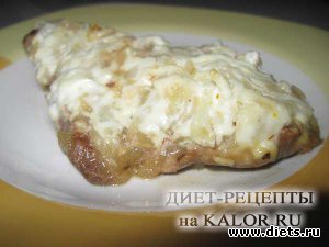 6. На каждый кусок фольги (смазанной оставшимся маслом) выложить кусочки печени, сверху яблоко, потом лук и полить сметанным соусом. Фольгу завернуть, сформировать конвертики