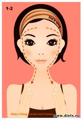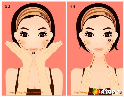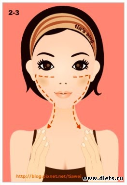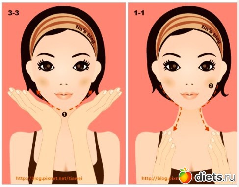 Положить ладони (самую мясистую часть) рук под подбородок, пальцами в сторону уха. Важно захватить не только челюстную кость, но и мышцы, расположенные непосредственно под подбородком. С заметным нажимом поднимайте ладони к козелку уха, от которого выполните завершающие движение, см. 1-1.