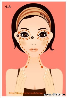 А. Поднимите руки к лицу. Поместите подушечки средних пальцев у внешних уголков глаз и легко, без нажима, подведите их к внутренним углам глаз, обходя сами углы (как внутренние, так и внешние - японцы называют их "головой" и "хвостом" глаз). Остановитесь у «точек красоты» возле внутренних уголков глаз. От них с достаточным нажимом «опишите» полусферу по верхнему краю глазничной кости к внешним углам глаз и остановитесь на 3 секунды у висков. Затем, опять слабо касаясь кожи, «дорисуйте» круг под нижним веком снова к внутренним углам глаз, к точкам красоты.
