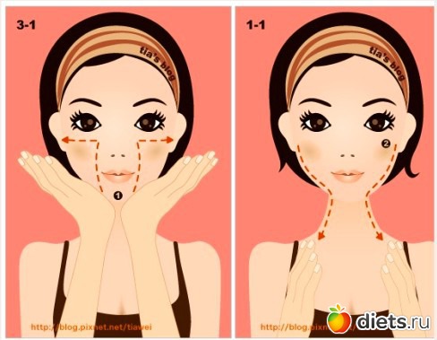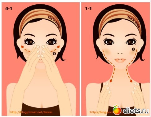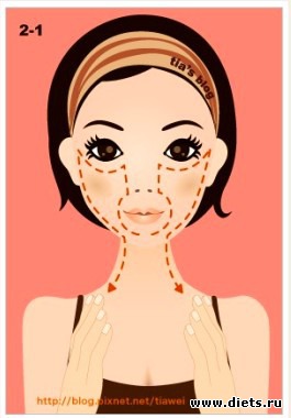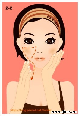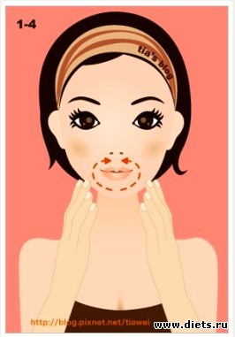 Мягко напрягите щеки, и с небольшим нажимом разводите пальцы от носа к козелкам ушей. Затем выполните завершающее движение, см. 1-1.