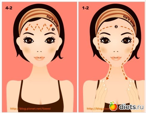 Плотно прижмите указательные, средние и безымянные пальцы обеих ладоней плашмя к центру лба. Сосчитайте до 3 и с давлением отведите их к вискам. Поверните ладони на 90 градусов вниз и, уменьшив силу воздействия, ведите их по боковым сторонам лица к ушам, затем, от ушей – выполните завершающее движение до ямок на ключицах. Повторите упражнение 3 раза.