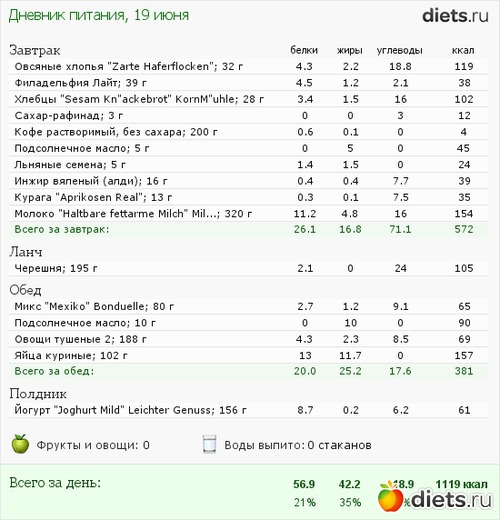 Итак, дневник питания таков (ужин там не указан, так как муж готовый купил и было бы ооочень сложно там что-то расчитывать, да и съела только половину)