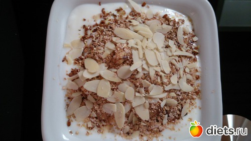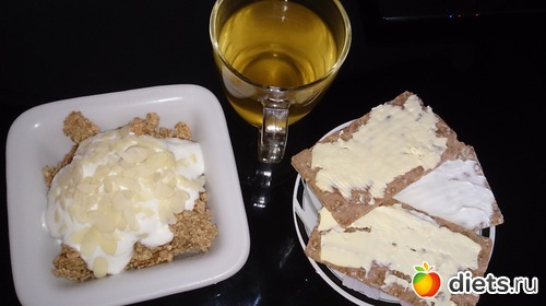 Завтрак: хлопья с йогуртом, миндальными хлопьями, чай с фенхелем, хлебцы с филадельфией и сливочным маслом