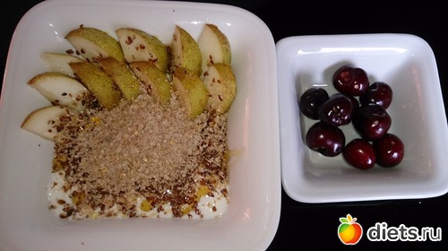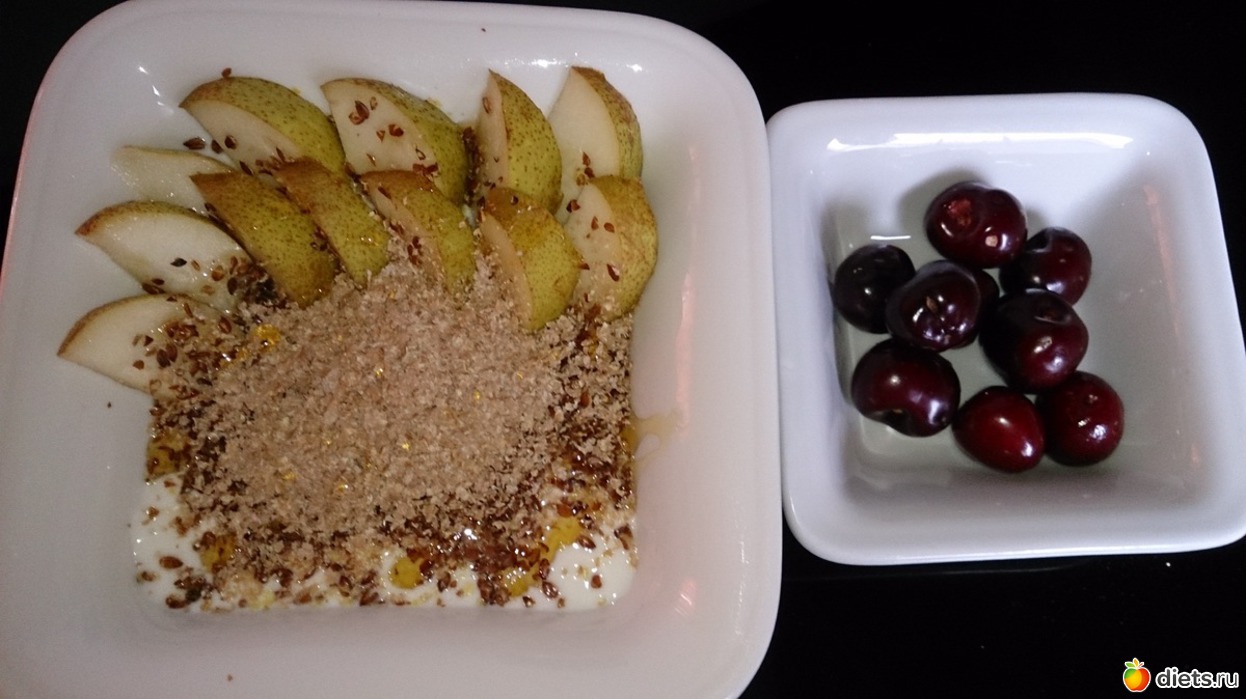 Ланч: йогурт с грушей, льняными семенами, пшеничными отрубями, черешня