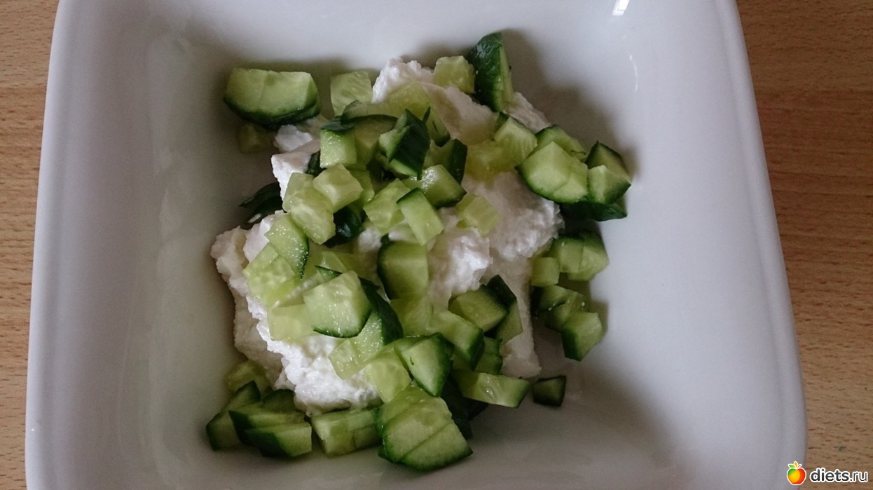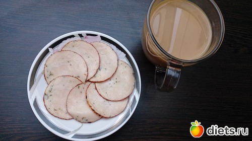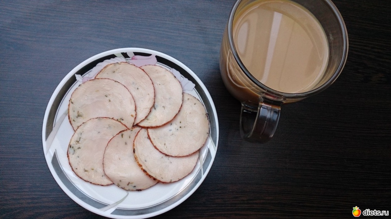 Ужин: творог с огурцом, кофе с молоком и колбаса из куриного филе